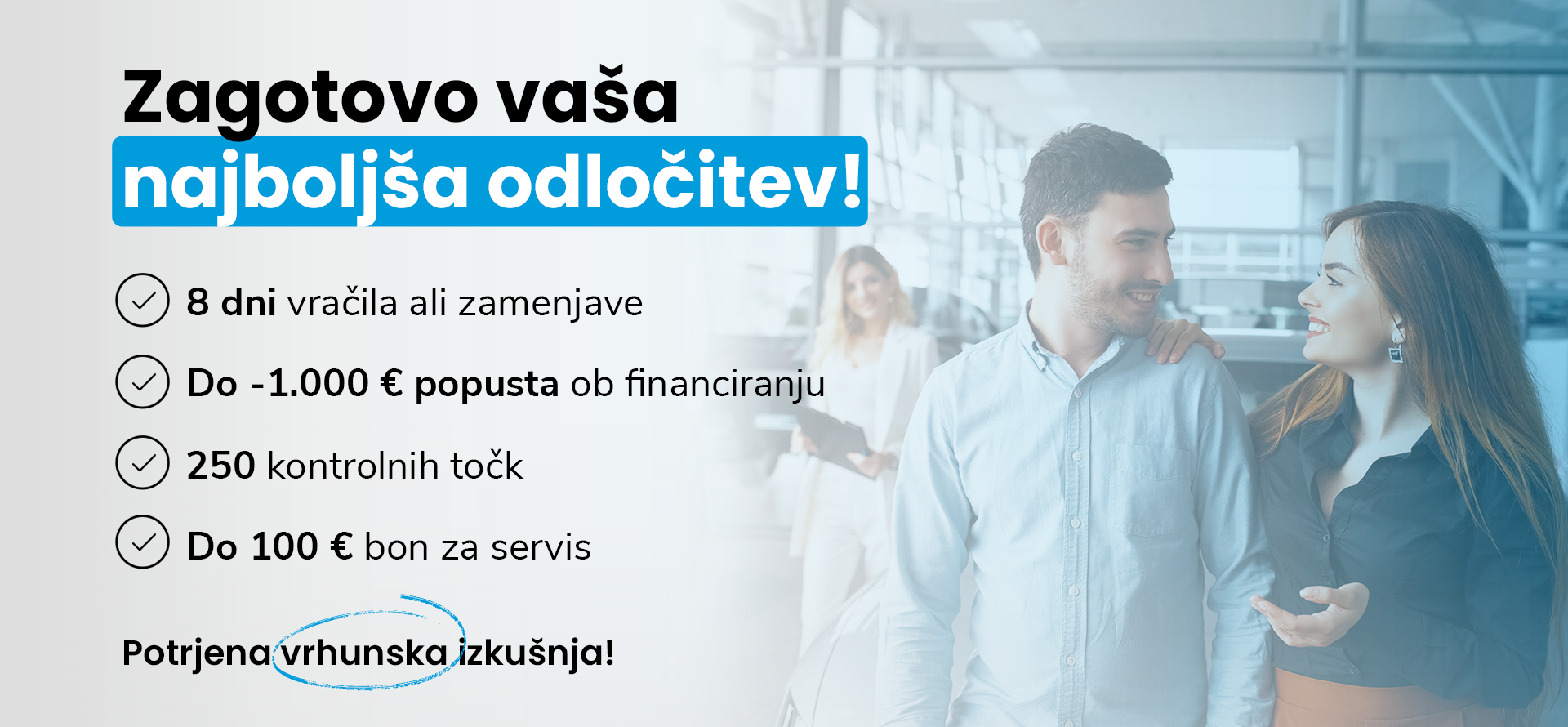 Garancija 8 dni za vračilo ali zamenjavo vozila: verjamemo v vrhunsko kakovost naših storitev, kljub temu pa vam EKSKLUZIVNO V SLOVENIJI omogočamo, da vozilo, če z njim ne bi bili zadovoljni, vrnete ali zamenjate v 8 dneh.
